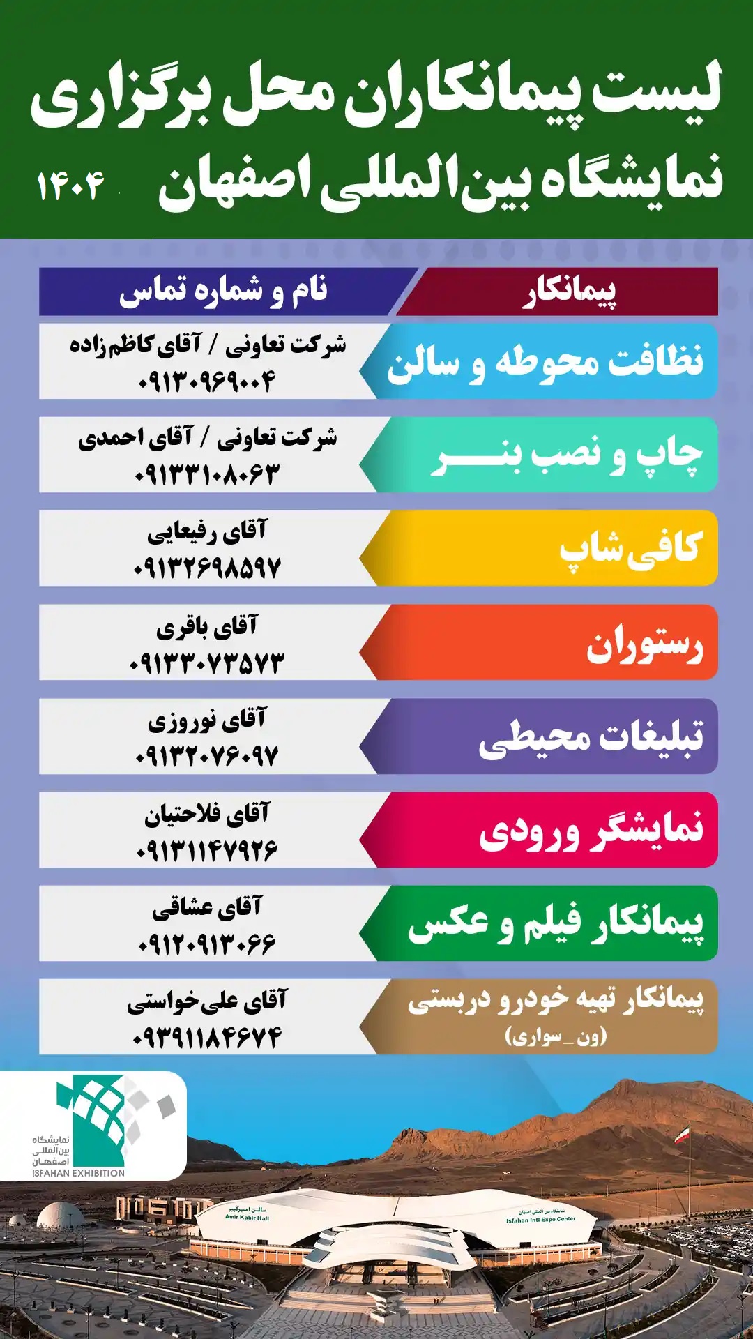 شركت نمايشگاههاي بينالمللي استان اصفهان فعاليت خود را در سال 1372 آغاز نمود و به لطف الهي تاكنون روند رو به رشدي را با سرعت قابل توجهي دنبال كرده است.شركت نمايشگاههاي بينالمللي استان اصفهان رسالت خويش را با برگزاري نمايشگاه با موضوعهاي متعدد و متنوع و با هدف اصلي ايجاد بستر اقتصادي مناسب، رقابت سالم، شناسايي واحدهاي برتر و ايجاد ارتباط بين اعضاي مجموعههاي مختلف صنعتي، فرهنگي، هنري، خدماتي و …