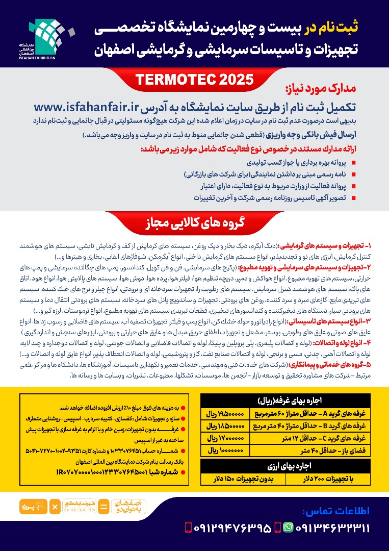 در صورتیکه قبلا در هریک از نمایشگاههای اصفهان شرکت کرده اید، قبل از ثبت نام، اطلاعات زیر را از طریق ایتا یا واتساپ به شماره ۰۹۱۳۴۶۳۲۳۰۱ ارسال فرمایید.